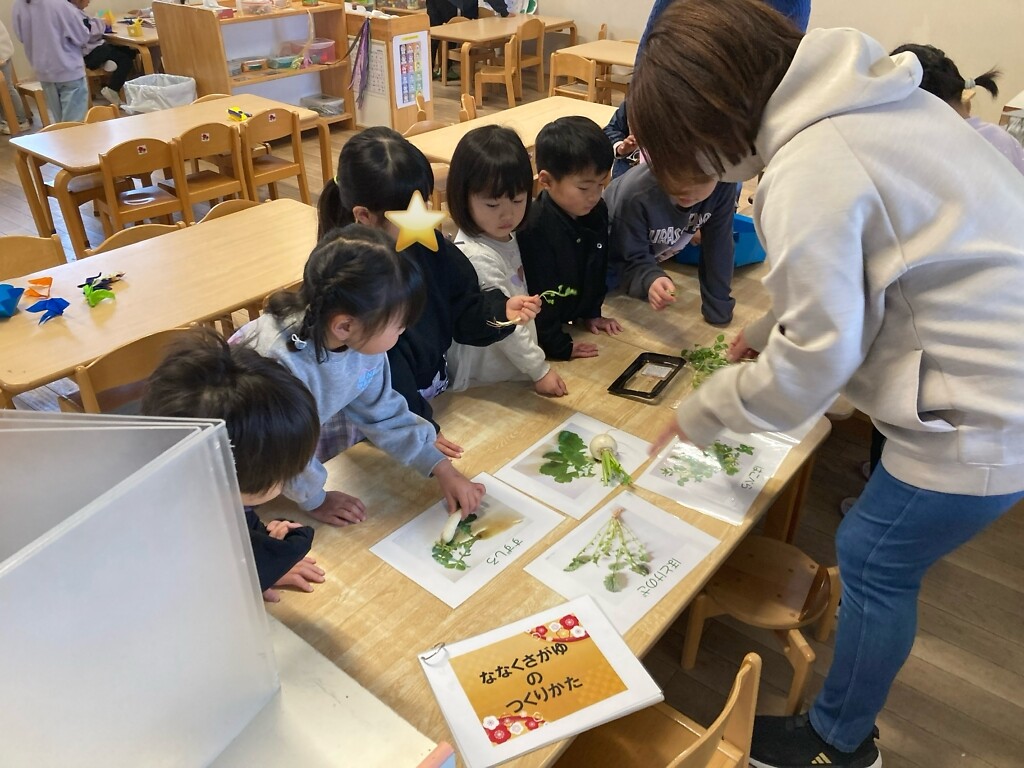 1月7日は、一年間の無病息災を願って七草粥を食べる日。みどり保育園では、毎年恒例の七草粥クッキングを行いました🌿