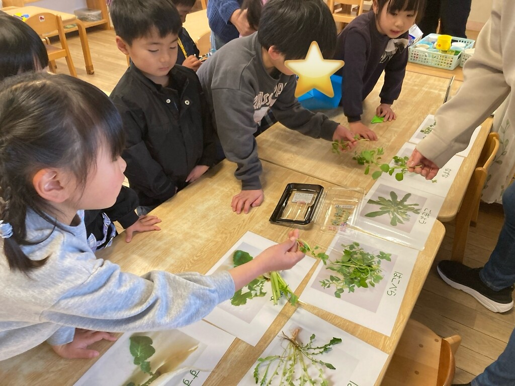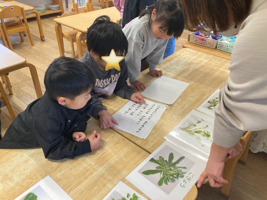 お部屋に掲示してあった七草の写真と、本物の七草を見比べながら「これはどれかな?」とみんなで相談。