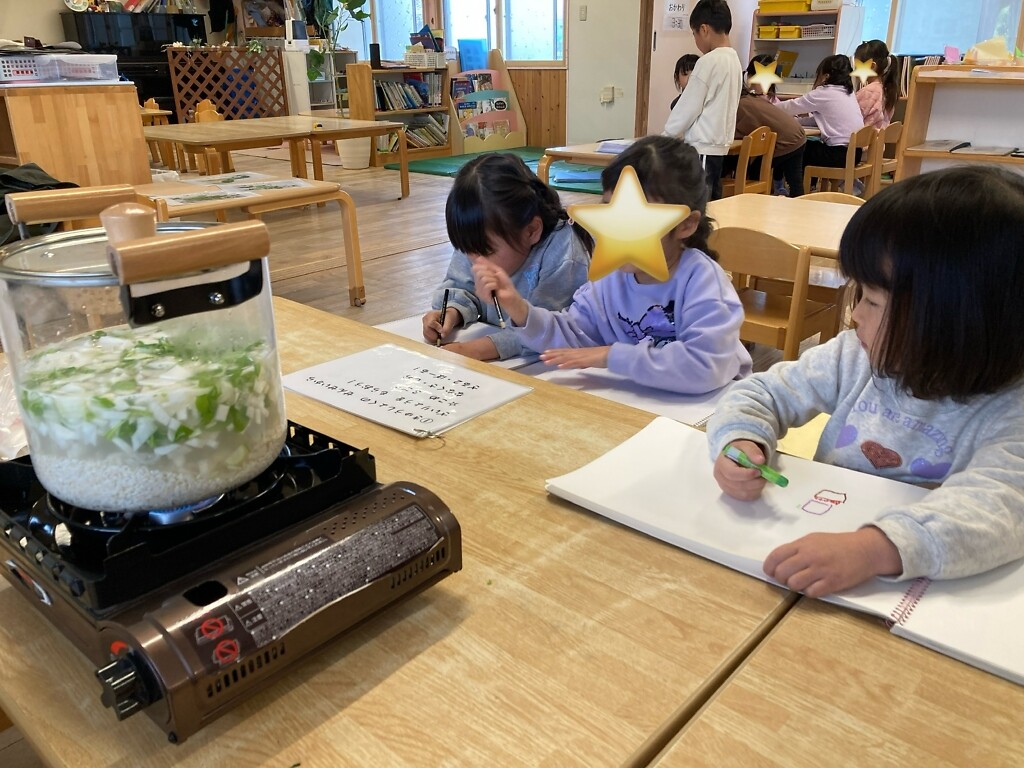 完成した七草粥は、みんなで「おいしいね」と笑顔でいただきました😊