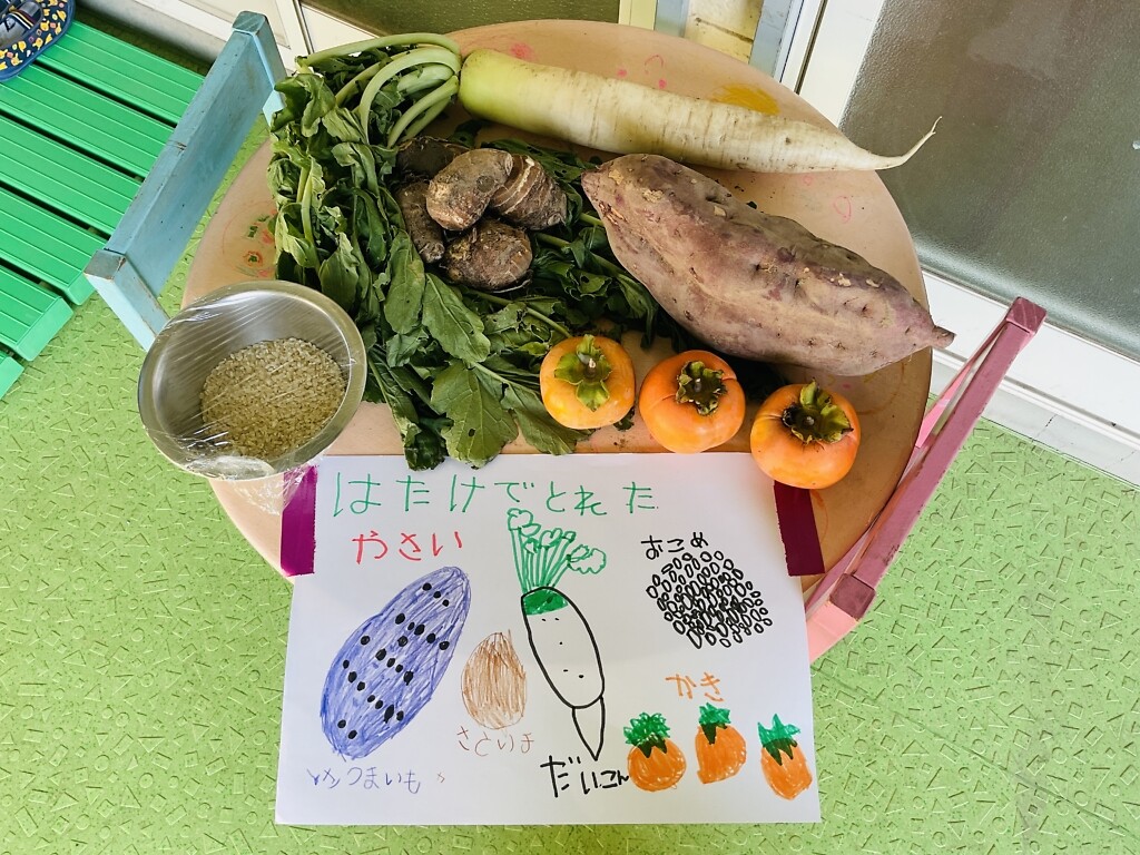 さらに園の畑でとれた里芋・大根・柿も仲間入りして、