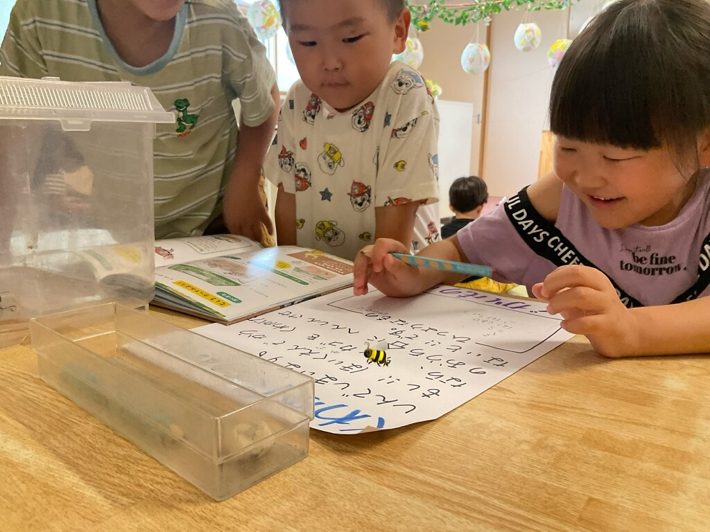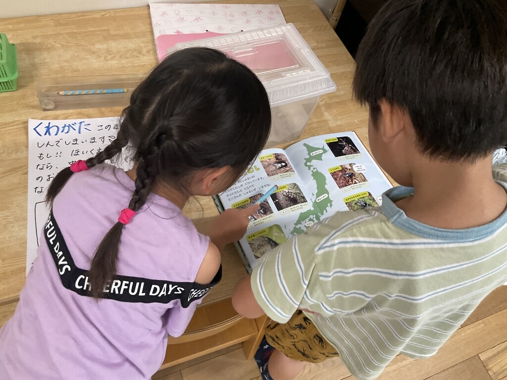 その日はたくさんの子がクワガタを観察👀でも飼うなら、ちゃんとお家を作ってあげないと!ということで、メモ書きを残すと、早速ばら(年長)さんが気付き、クワガタを飼うのに必要なものは。。と本を持ってきて調べ始めました📖