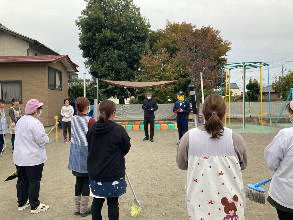 本庄警察署の方にお越しいただき、不審者が園内に侵入してしまった状況を想定した本番さながらの訓練を実施。110番通報から、警察到着までの対応、職員の動き、連携の取り方まで一つひとつ確認しました。