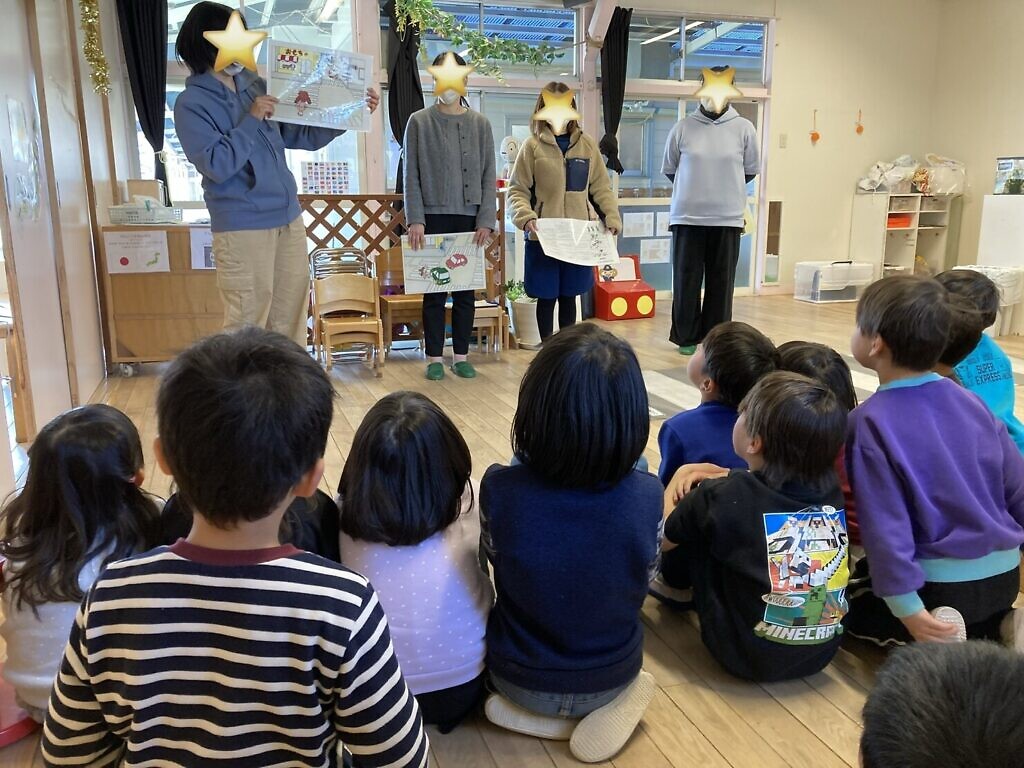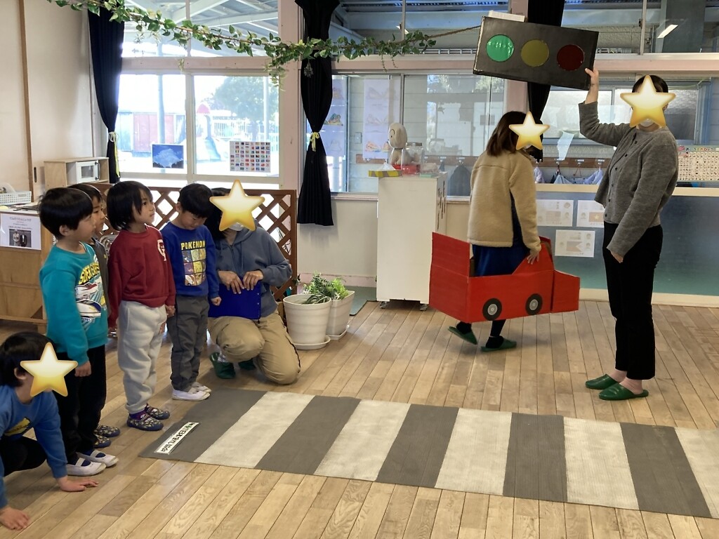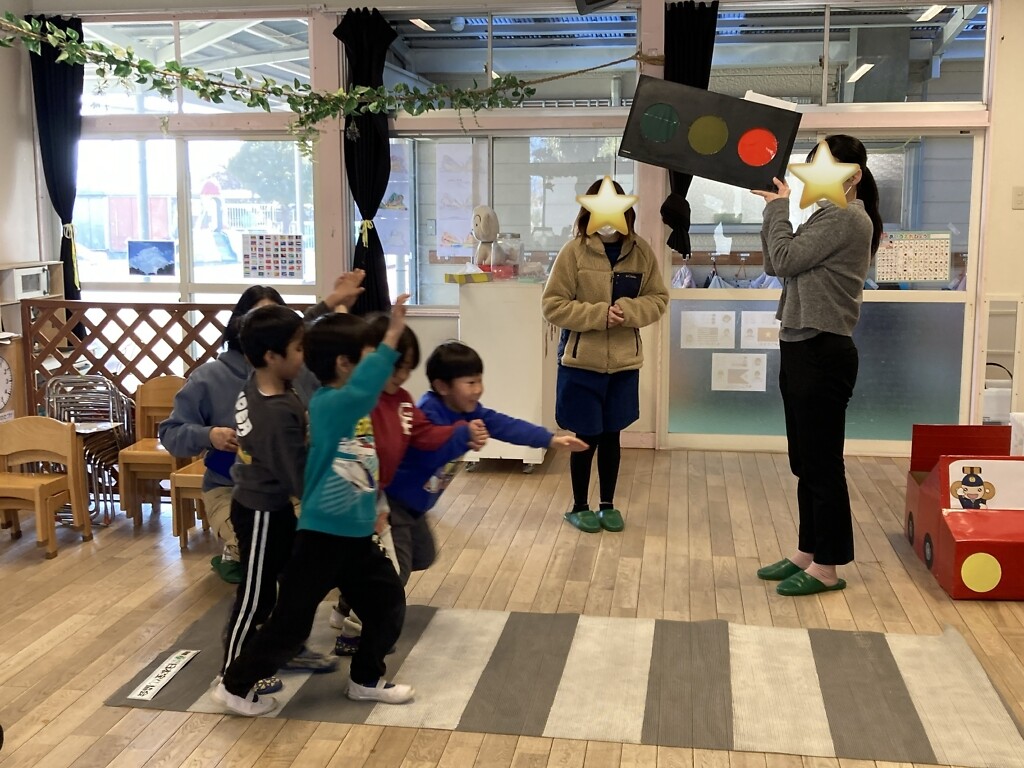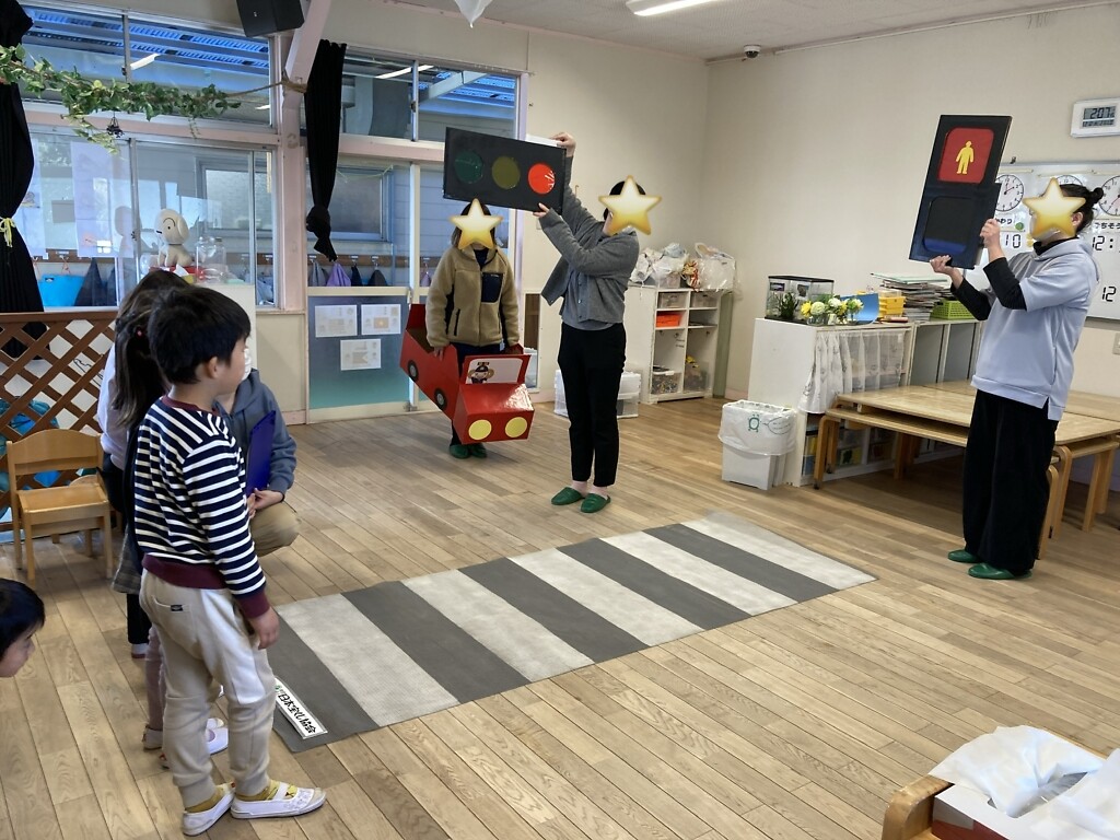 紙芝居を読んでいただいたり、手作りの横断歩道や信号を使って、実際に渡る練習をしたりと、楽しみながら交通ルールを学ぶことができました🚥